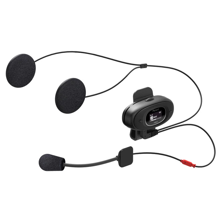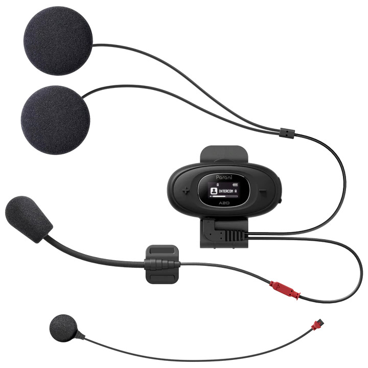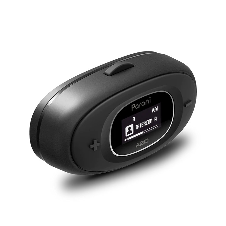 The Parani A20 is a sleek Bluetooth® intercom headset designed to fit most motorcycle helmets. A20 brings a premium audio experience to the conversation, with a 30% increase in the intercom system’s bass and overall clarity. Up to quality further with 2-way HD Intercom, which is enabled when two Parani users pair their devices to one another. The Parani A20 supports up to four Parani Bluetooth intercom devices pairing to each other, allowing users to communicate with an effective range of up to 1 km (0.6 mi) and an impressive talk time of 16 hours. The headset sports a three-button control screen and an LCD screen, giving users quick visual cues on statuses such as volume level, battery life, and more. Parani A20 includes both a boom mic and a wired mic for user preference.
