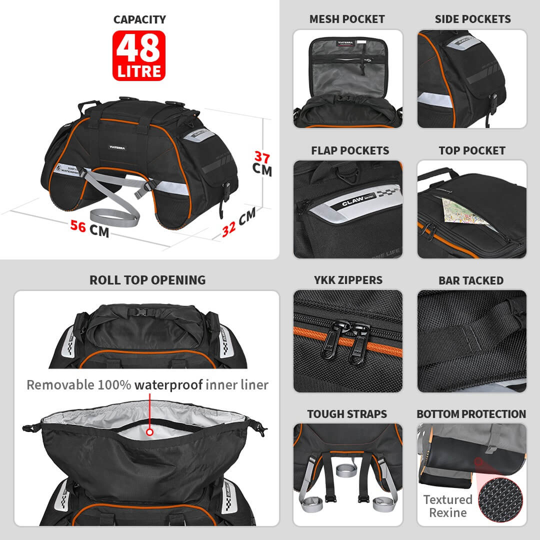 The 100% Waterproof Claw Mini is the improved version of the universal luggage system that is compatible with almost all motorcycles (comes with an external rain cover & inner 100% Waterproof liner). The compression bag needs to be purchased separately.