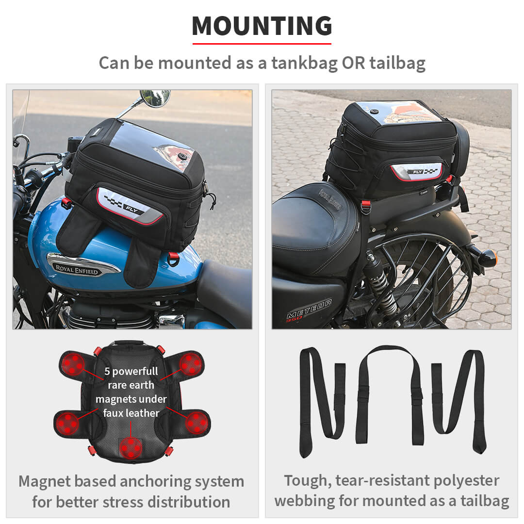 Constructed from EVA laminated fabric and with PP support to retain shape, the Fly tankbag is spacious, durable and easily converts into a backpack or a tailbag. The magnet based system has been designed to work on metal tanks and comes with an external rain/ dust cover.