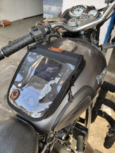 Wolverine Magnetic Tank Pouch, made with high abrasion resistant fabric, and 6nos Strong Hold Rare Earth Neodymium Magnets for superior grip, makes this tank pouch suitable for ALL MOTORCYCLES with METAL TANKS. It will hold a mobile phone up to 8″ in size, inside the touch friendly transparent front pocket. Inner flap pocket you can keep your bike documents, bike cloth, small nick nacks and other small items. This tank pouch comes with a Rain Cover and Sling strap, which may also be used for additional reinforcement if riding on very high speeds. You will never need the six months warranty we give on our products.